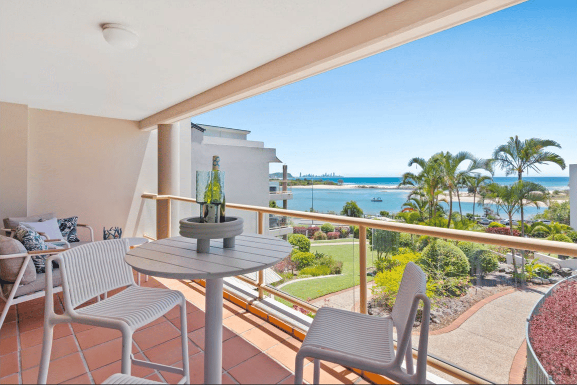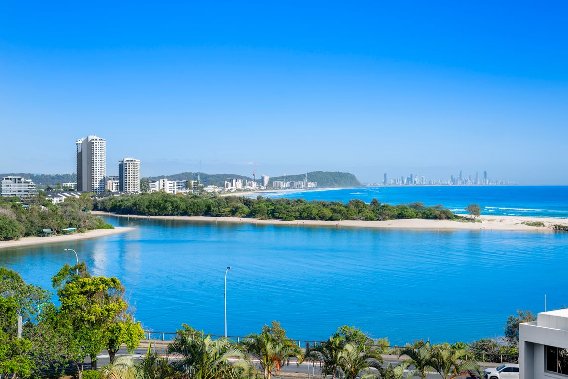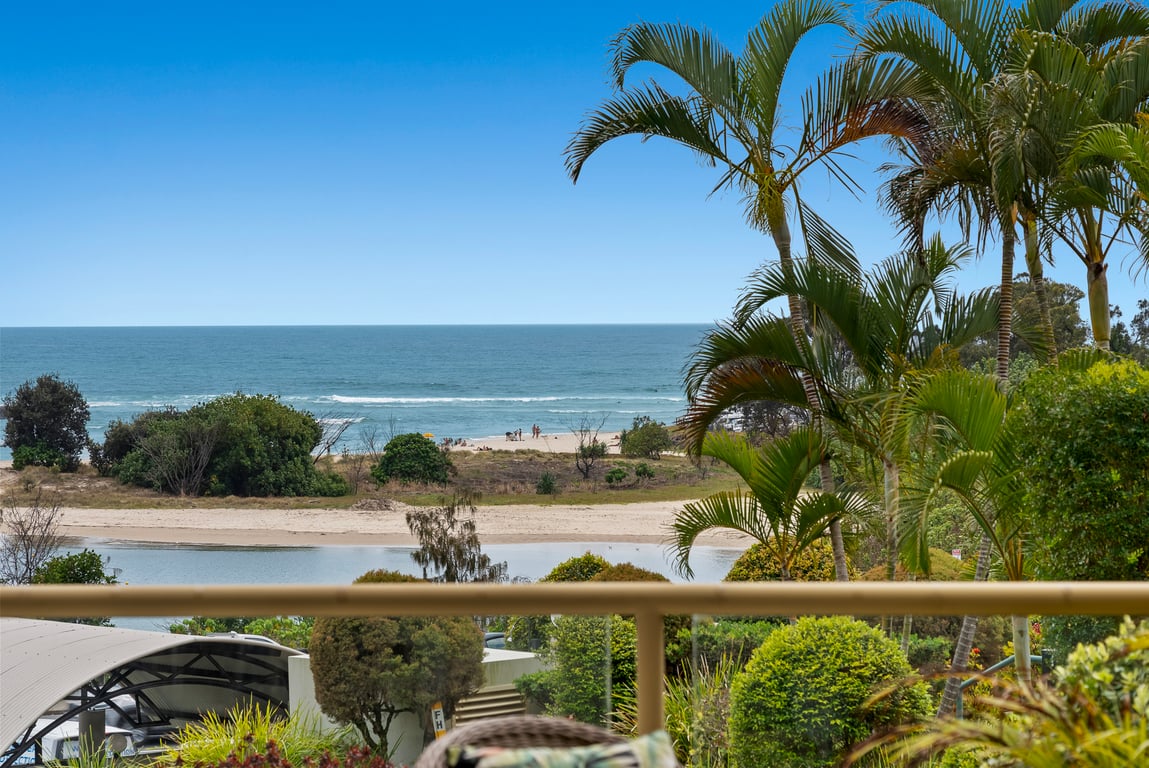 North facing views over Currumbin eastery,ocean entry and rolling surf with the distant Surfers Paradise all the way to the Stradbroke Islands.Watching the ebb and flow of the tides which are only 80 metres away!Very comfortable 2 and 3 bedroom units abutting a heavily wooded green belt area.Locally it a short 1k walk to Currumbin cafes and Surf Club perched on a rock on the ocean foreshore.The main Pines shopping centre was accessible by public bus from outside the units.The two negatives was no lifts and it is under the flight path for Coolangatta airport but in my opinion the breathtaking views cancel that out.